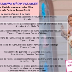 Durante los días de la Novena, todas las mañanas del 24 al 28 de Junio, cada curso del Nivel Secundario tuvo a su cargo el rezo de la misma,donde interpretaron distintos pasajes de la historia de la Virgen del Huerto para culminar con el canto en su honor. Y por las tardes, se realizo la Santa Misa y el rezo de la Novena con cada uno de los grados del Nivel Primario y con todas las personas que trabajan en el Colegio, ex alumnas, MOMIGI, MOLAGI, Teatro y Grupos de Oración.