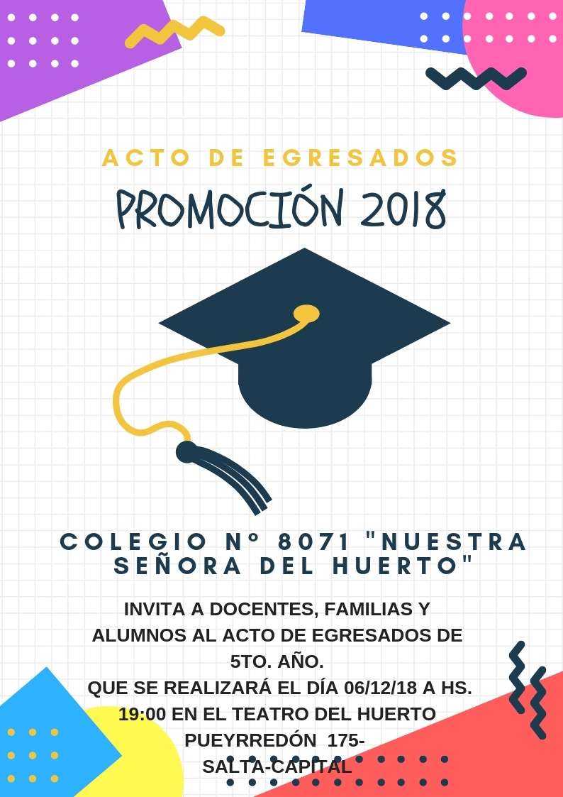 Acto de Egresados de 5to. Año, de las alumnas del Colegio N°8071 "Nuestra Señora del Huerto". Se realizará el día 06/12/2018 a las 19hs. En el Teatro del Huerto, Pueyrredón 175. CP 4400-Salta.